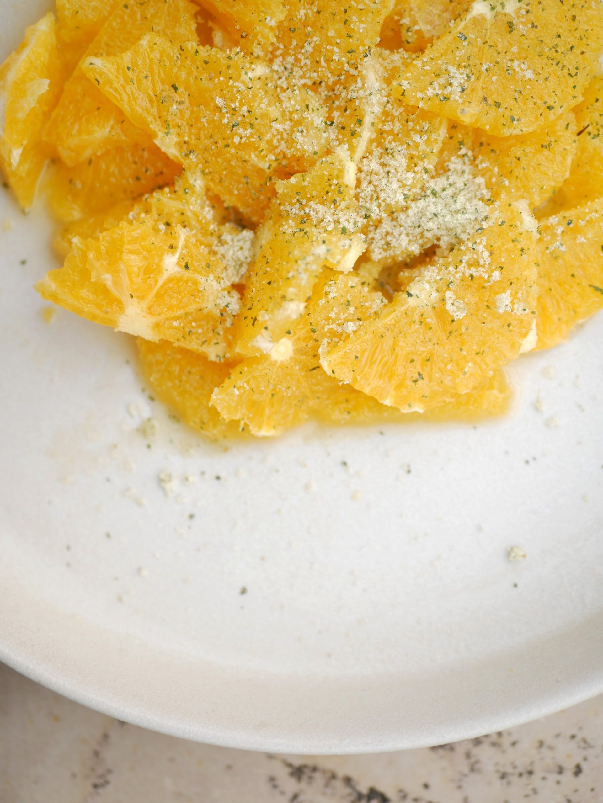 Sucre blanc, tagete passion feuilles, tagete mandarine fleurs.